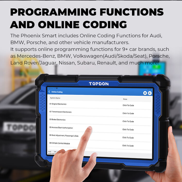 The Phoenix Smart includes Online Coding Functions for Audi, BMW, Porsche, and other vehicle manufacturers.